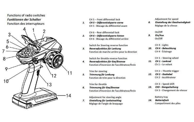 – 2x 2-Pos Schalter oben auf dem Sender (Differenzialsperren vorne / hinten)